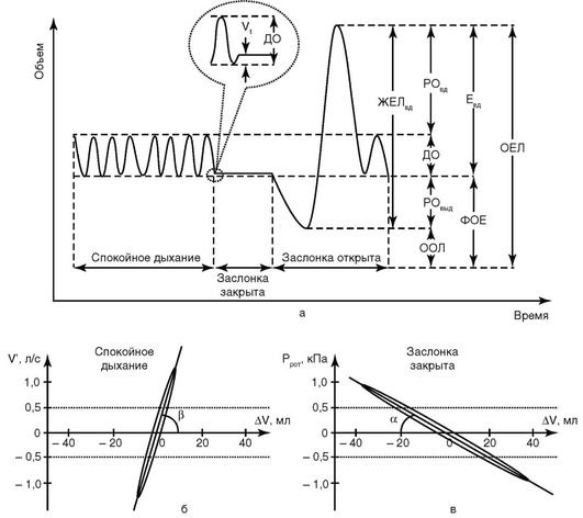 Рис. 10.34. Схематическое изображение измерений при общей плетизмографии: а - последовательность выполнения дыхательных маневров и определение статических легочных объемов; б - измерение специфического бронхиального сопротивления - петля sRaw; в - измерение внутригрудного объема - петля внутригрудного объема